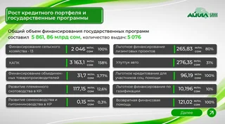 Ошондой эле “Айыл Банк” мамлекеттик программалар аркылуу кардарларды каржылоо иштерин активдүү жүргүзүп келет. Жыл башынан бери мамлекеттик программаларды каржылоо 5 млрд 861 млн сомду түздү. Бул каражаттан 5076 жолу насыя берилди.