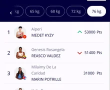 Рейтингде кыргыз балбанынан кийин экинчи орунда эквадорлук спортчу, үчүнчү сапта Кубанын өкүлү жайгашты.
