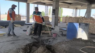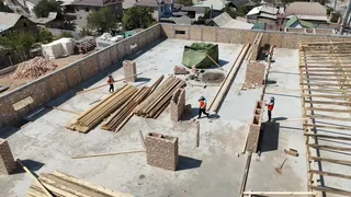 Учурда имараттын чатырын жабуу, кирпич дубалдарды көтөрүү иштери жүрүп жатат.