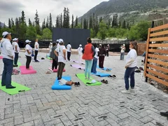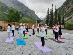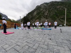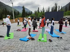 Катышуучулар Ала-Тоо кучагында жайгашкан жаратылыш паркында тажрыйбалуу инструкторлордун жетекчилиги астында йога көнүгүүлөрүн жасашты.