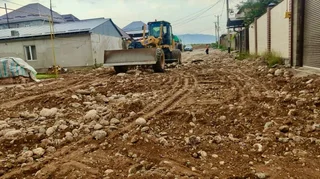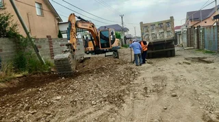 Бишкек, 23.06.25. /Кабар/. Алтын-Ордо конушундагы Кадыр-Ата көчөсүндө жол оңдоо иштери жүрүүдө.