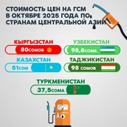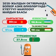 Монополияга каршы кызматтынын маалыматына ылайык, жыл башынан бери АИ-92нин баасы орточо 8,5 сомго, АИ-95 - 6,5 сомго, дизель 5,5 сомго кымбаттаган. 2024-жылдын октябрында АИ-95 - 74,4 сом, АИ-92 - 67,4 сом, ал эми дизель - 75,3 сом болгон.