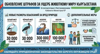 Жаңы ченемдерге ылайык, тоо текени мыйзамсыз атуу үчүн айып пулдун өлчөмү үч эсеге жогорулап, 300 000 сомду, ал эми элик үчүн 100 000 сомду түздү. Ошондой эле ак жана кара илегилектерге зыян келтиргендиги үчүн 30 000 сом өлчөмүндө айып пул белгиленди.