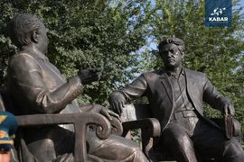 “Ысык-Көлдө Мухтар Ауэзовдун үй-музейи бар. Ошол жерде ал Чыңгыз Айтматов менен көп жолу жолукчу экен. Мен ошол жолугушуулардын бирин чагылдыргым келди. Эстеликте экөө маектешип отурушат. Мухтар Ауэзов Айтматовдон 30 жаш улуу болгондуктан, ал улуу муундагы адам катары ага накыл-кептерин айтып жатат, Айтматов аны кунт коюп угуп жатат. Айтматов колунда “Манас” эпосунун китебин кармап отурат. Аны чагылдыруумду себеби, 1952-жылы “Манас” эпосун элдик тарыхтан алып салуу тууралуу демилге көтөрүлгөндө, Мухтар Ауэзов бул чечимге каршы чыгып, эпосту коргогон. Мен бул тарыхый окуяларды эске алып, баарын бир композицияда чагылдырдым”,-деди ал.