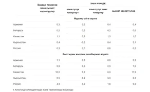 Биримдиктеги өлкөлөрдө азык-түлүк эмес инфляция ар башка динамиканы көрсөткөн. 2025-жылдын июнь айында 2024-жылдын июнь айына салыштырмалуу жылдык азык-түлүк эмес инфляция Беларуста 3,2%га, Кыргызстанда 5,5%га жана Россияда 4,5%га чейин басаңдаган. Арменияда дефляция байкалган (-0,2%). Ал эми азык-түлүк эмес товарлардын инфляциясы Казакстанда тездеген (9,4%).