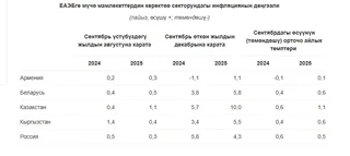 2025-жылдын сентябрында 2024-жылдын декабрына салыштырмалуу экономиканын керектөө секторунда инфляциянын эң жогорку деңгээли (10,0 пайыз) Казакстанда катталган, бул баанын азык-түлүк товарларга (9,9 пайызга), азык-түлүк эмес товарларга (8,0 пайызга), ошондой эле кызмат көрсөтүүлөргө тарифтердин (11,9 пайызга) жогорулашы менен шартталган.