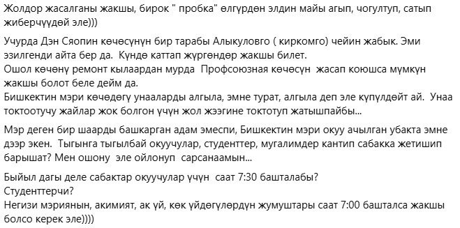 Белгилей кетсек, өткөн жумада Бишкек шаарынын мэри Айбек Жунушалиев шаардык кызматтар менен биргеликте курулуш иштери жүрүп жаткан жолдорду кыдырып чыккан. Анда мэр бир иштерди тездетүүнү тапшырып, 20-октябрга чейин толук бүтүрүү керектигин айткан.