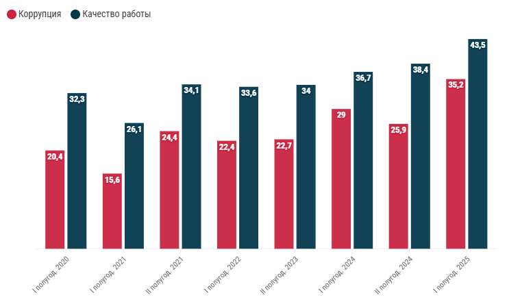 2025-жылдын биринчи жарым жылдыгынын жыйынтыгы боюнча Кыргызстанда коррупцияны кабылдоо индекси 35,2 баллга чейин өскөндүгү Улуттук статистикалык комитеттин жарым жылдык отчетунда айтылган. Индекс -100дөн +100гө чейинки балл менен бааланат. Ал канчалык жогору болсо, ишеним ошончолук чоң болот. Улутттук статистика комитети сурамжылоону өлкөнүн бардык аймактарында 18 жаштан 75 жашка чейинки 3,6 миң адамдын арасында жүргүзгөн. Акыркы маалыматтар коррупциялык тобокелдиктердин азайгандыгын айгинелейт.