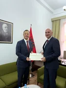 Бишкек, 09.07.25. /Кабар/. Күн мурун Кыргызстандын Албаниядагы элчиси (резиденциясы Анкара шаарында) Руслан Казакбаев Албаниянын Тышкы жана Европалык иштер министрлигинин Мамлекеттик протоколунун директору Ариан Спассага ишеним грамотасынын көчүрмөсүн тапшырды.