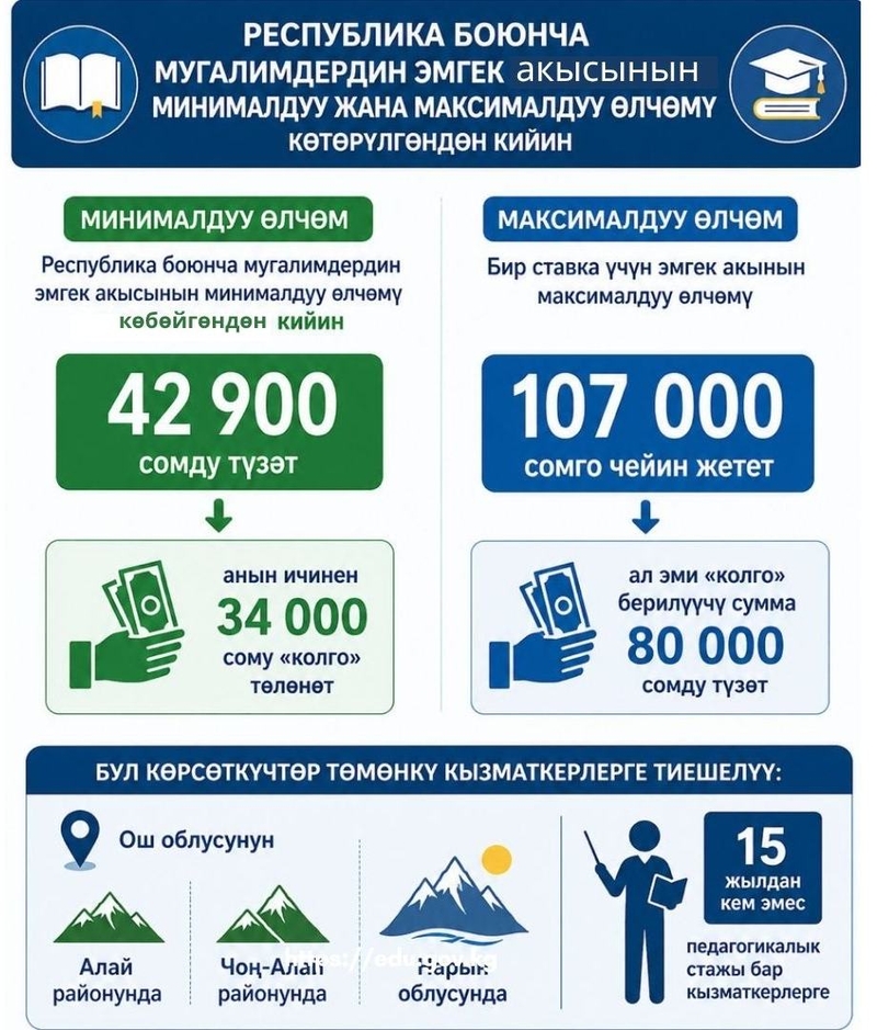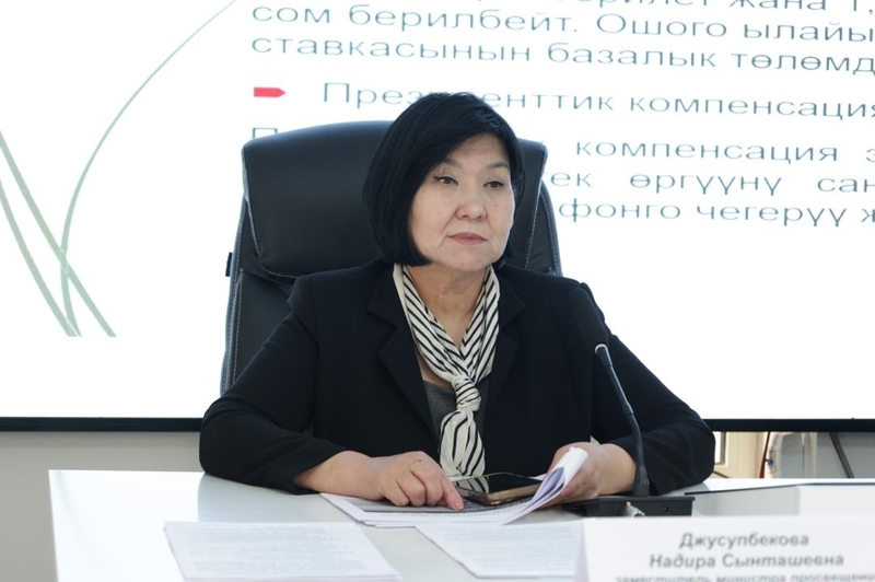 Анын айтымында, 2026-жылдын 26-мартындагы президент Садыр Жапаров кол койгон №121 “Кыргыз Республикасынын бюджеттик чөйрөсүнүн айрым кызматкерлеринин эмгек акысын төлөө шарттарын жакшыртуу чаралары жөнүндө” жарлыгынын, ошондой эле министрлер кабинетинин №286 токтомунун негизинде билим берүү тармагындагы кызматкерлердин айлык акысы орточо эсеп менен эки эсеге көбөйтүлдү.