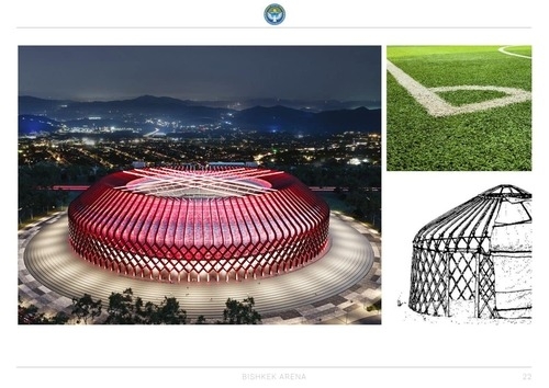 Белгилей кетсек, курулуш ФИФАнын бардык талаптарына ылайык жүргүзүлүп, эл аралык деңгээлдеги матчтарды, анын ичинде чейрек финалга чейинки оюндарды өткөрүүгө ылайыкталат. Келечекте стадиондо Азиянын премьер-лигаларын да кабыл алууга мүмкүнчүлүк түзүлөт. Имараттын дизайны боз үй түзүлүшүндө болуп, кыргыз маданиятынын уникалдуу элементтерин камтымакчы. Курулушту 2026-жылы аяктоо пландалган.
