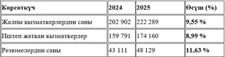 Бүгүнкү күндө "e-Kyzmat" системасында 222 289 кызматкер тууралуу маалымат санариптештирилген, алардын ичинен 174 160 - учурда иштеп жаткандар, ал эми 48 129 - резюме банкындагы резюмелери барлар.