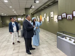 Бишкек, 27.08.25. /Кабар/. Мамлекеттик катчы Марат Иманкулов Бишкек шаарындагы Сүрөтчүлөр союзунун имаратында өткөн "Умай Ашуу: Манастын коду" аттуу көргөзмөнүн ачылышына катышты.