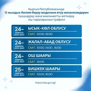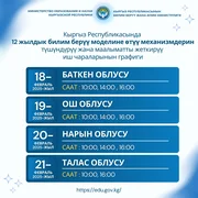 Билим берүү жана илим министрлигинен билдиришкендей, тренингдер 12 жылдык билим берүү моделине өтүү механизмдерин түшүндүрүү максатында уюштурулууда.