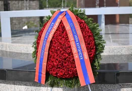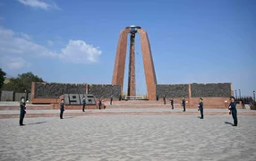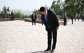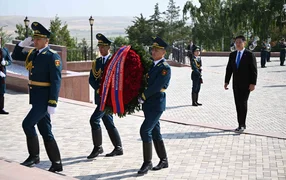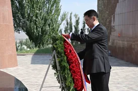 Монголиянын президенти Ухнаагийн Хурэлсух, министрлер кабинетинин төрагасы Адылбек Касымалиевдин коштоосунда 1916-жылдагы каргашалуу окуялардын курмандыктарына арналган мемориалга гүлчамбар койду.