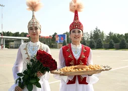 Улуттук кийимчен кыздар Ухнаагийн Хурэлсухту тосуп алып, ага гүл, боорсок менен бал тартуулашты.