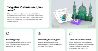 - Мурабаха бизнеси — бул пайызы жок каржылоо. Каражатты жабдык, коммерциялык кыймылсыз мүлк же айыл чарба продукцияларын сатып алуу үчүн колдонсо болот.
