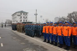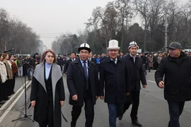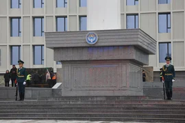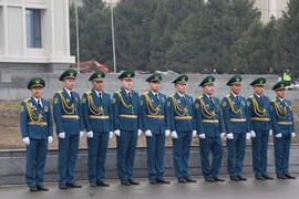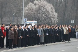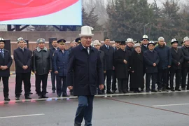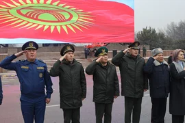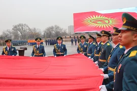 Иш-чаранын жүрүшүндө жоокерлер шаардын борбордук аянтына мамлекеттик тууну көтөрүштү.