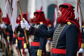 Аэропортто Кыргызстандын жана Бахрейндин мамлекеттик туулары илинип, килем төшөлүп, ардактуу кароол тизилди.