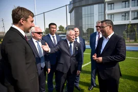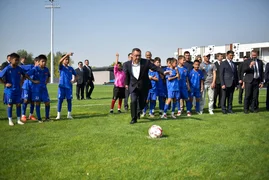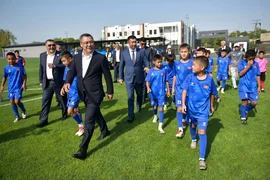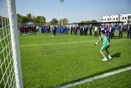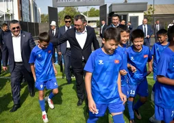 Мамлекет башчысы комплекстин шарттары менен таанышып, инфраструктураны көрүп чыкты жана жаш футболчулар менен бирге футбол талаасына чыгып, дарбазага топ киргизип, биргеликте эстеликке сүрөткө түштү.