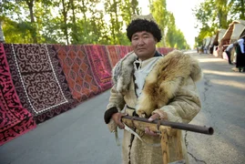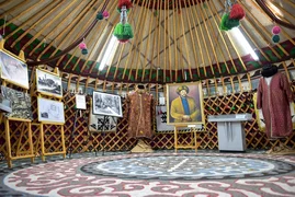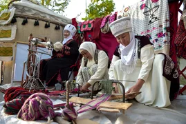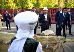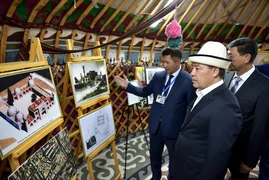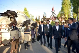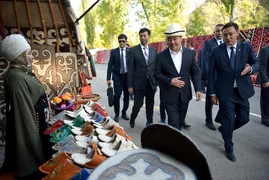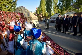 Андан соң президент улуттук маданияттын экспонаттары, салттуу турмуш-тиричилик элементтери жана уз-чеберлердин заманбап чыгармалары коюлган көргөзмө менен таанышты.
