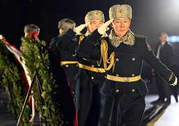 Аскердик оркестрдин коштоосунда гвардиячылар мемориалга гүлчамбарларды коюп, андан соң мамлекет башчылар баш ийип, курман болгон баатырларды эскеришти.