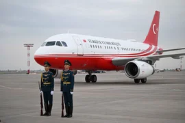 Аэропортто эки мамлекеттин туулары илинип, Ардактуу кароол ротасы тизилип, килем төшөлдү.