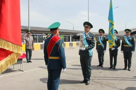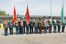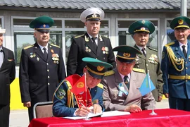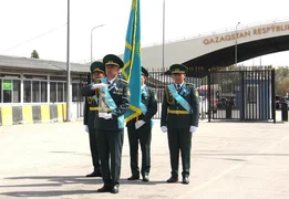 Мекеменин маалыматына ылайык, Казакстандын чек ара кызматынын өкүлдөрү "Жеңиш эстафетасын " кыргыз кесиптештерине өткөрүп беришти.