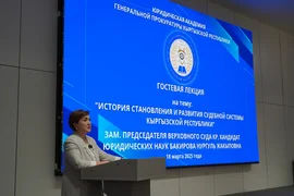 Бишкек, 19.03.25. /Кабар/. Жогорку соттун төрагасынын орун басары Нургуль Бакирова Башкы прокуратуранын Юридикалык академиясынын студенттерине "Кыргыз Республикасынын сот тутуму" темасында лекция окуду.