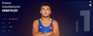 Бишкек, 22.04.26. /Кабар/. Кыргызстандык балбан Эрназар Акматалиев эркин күрөш боюнча 70 кг салмак ченинде Дүйнөлүк күрөш уюмунун рейтингинде биринчи сапка жайгашты. Спортчу жалпысынан 48 миң 500 упай топтогон.