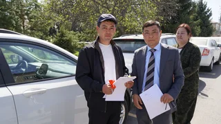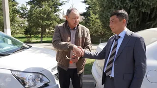 Жаңы унаалардын ачкычтарын Каракол шаардык муниципалдык мүлк башкармалыгынын башчысы Саламат Чыныбеков тапшырды.