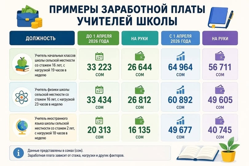 Анын айтымында, 2026-жылдын 26-мартындагы президент Садыр Жапаров кол койгон №121 “Кыргыз Республикасынын бюджеттик чөйрөсүнүн айрым кызматкерлеринин эмгек акысын төлөө шарттарын жакшыртуу чаралары жөнүндө” жарлыгынын, ошондой эле министрлер кабинетинин №286 токтомунун негизинде билим берүү тармагындагы кызматкерлердин айлык акысы орточо эсеп менен эки эсеге көбөйтүлдү.