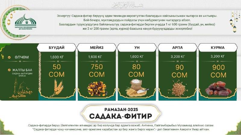 Дин башкармалыктан билдиришкендей, буудай, ун, мейизден 1 килограмм 600 грамм, ал эми арпа жана курмадан 3 килограмм 200 грамм же алардын акчалай наркы менен берүү керек.