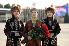 Улуттук кийимчен кыздар Эмомали Рахмон менен учурашып, ага гүл сунушту.