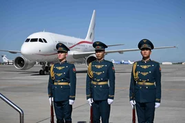 Аэропортто эки өлкөнүн мамлекеттик желектери илинип, ардактуу кароол тизилди.