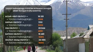 Экономика жана коммерция министрлиги “Кабар” агенттигине аймактарда аткарылып жаткан иштер боюнча маалымат берип, алыскы тоолуу райондордо жумуш орундарын түзүү аракеттери жүрүп жатканын билдирди. Алсак, алыскы Чаткал, Тогуз-Торо, Ала-Бука, Чоң-Алай, Кара-Кулжа, Ак-Талаа, Ат-Башы, Ак-Суу сыяктуу бир катар райондордун бийик тоолуу жерлеринин тургундарына жумуш менен камсыз болууга мүмкүнчүлүк түзүлгөн.